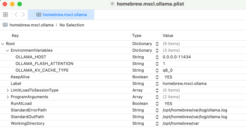 Now we need to tell Ollama to listen to all interfaces – this makes it accessible, since by default it binds only to localhost. There’s a GitHub issue about this if you want more details. We have to edit the plist: