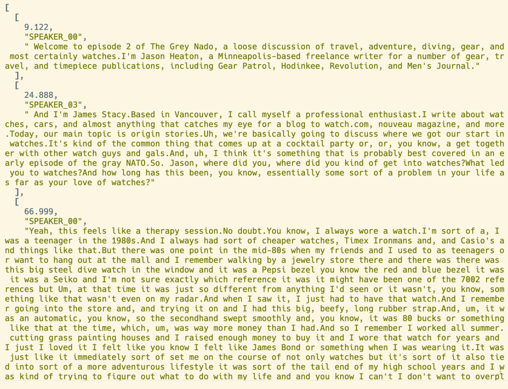 So now we have roughly an hours’ worth of audio, as JSON, with labels as to speaker. But the labels are not the names of the speakers. ‘SPEAKER_00‘ isn’t helpful. We need the names.