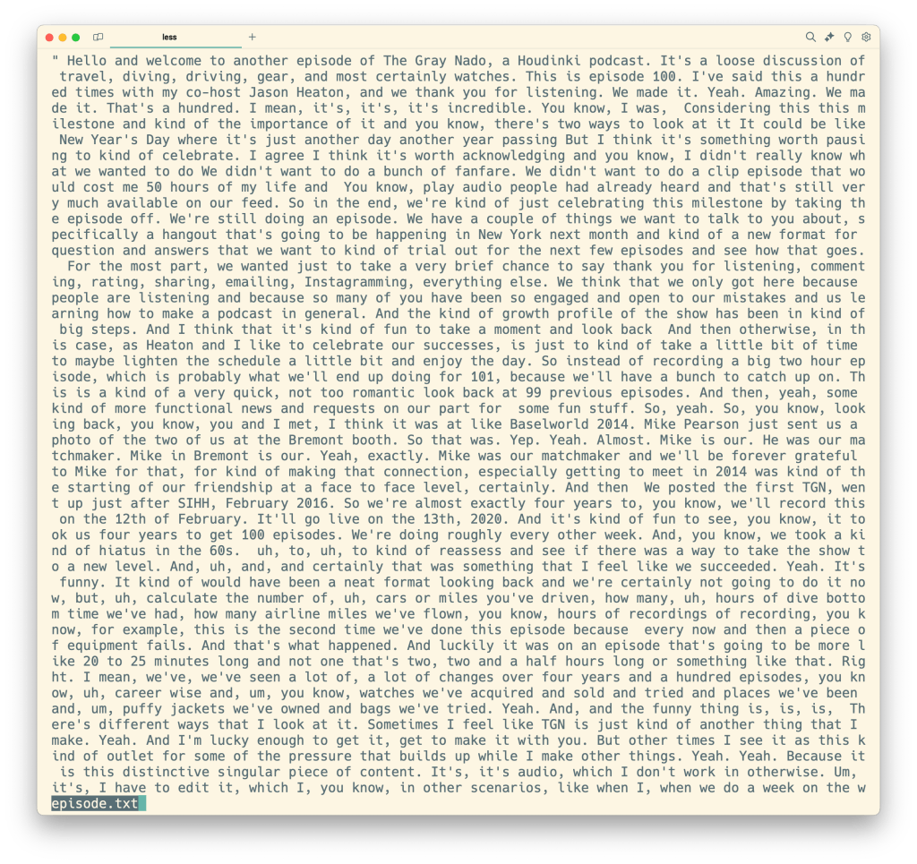 Anyway, that gave me an idea: a couple of friends of mine run a podcast called TGN. They’ve been at it for a few years, and have around 250 episodes of an hour each. Could I use whisper.cpp to produce a complete set of episode transcripts? If I did, would that be useful?