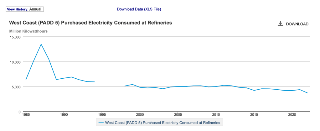 To get an answer, my friend found the government page showing the energy used by “Petroleum Administrative for Defense District 5. Basically, west-coast refineries.”. It’s here. A snapshot graph: