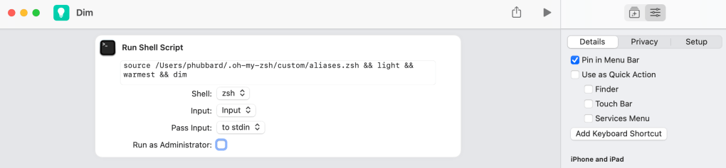 source /Users/phubbard/.oh-my-zsh/custom/aliases.zsh && light && warmest && dim