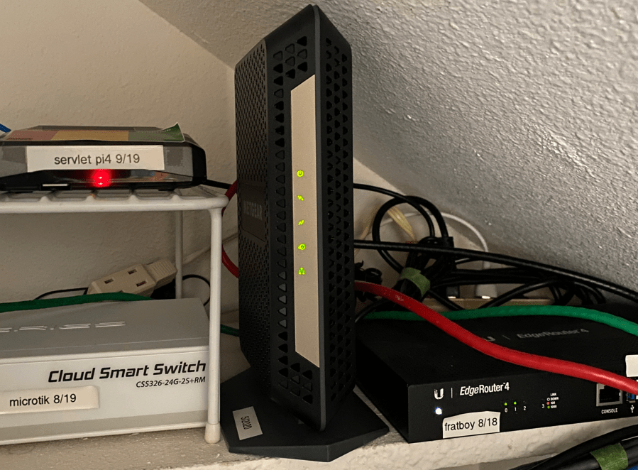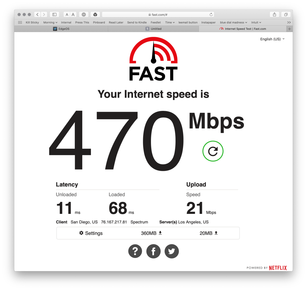 In San Diego, we have decent ISP options, and for a while we even had the possibility of Google Fiber. (That would have been awesome.) I’ve been on Spectrum, FKA Time Warner, for a few years at 300/25Mbit, and today a technician came by, swapped out our cable modem and upgraded us to “up to 940Mbit.” The Spectrum page with availability check is here.