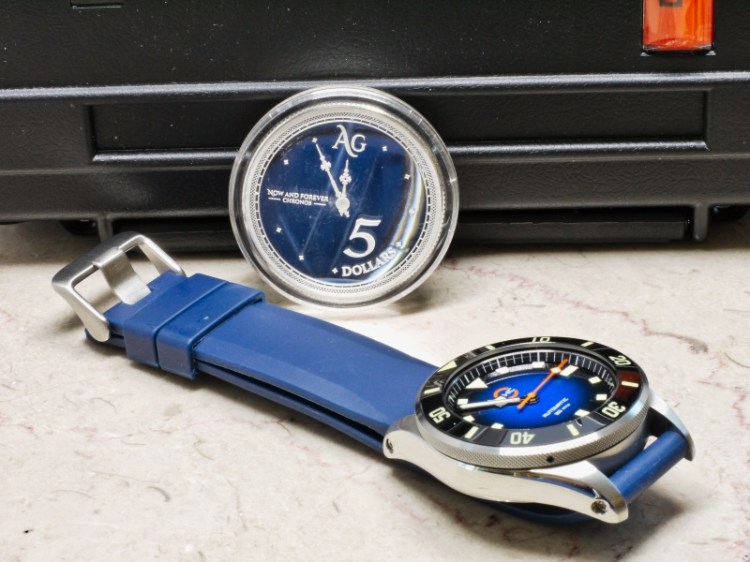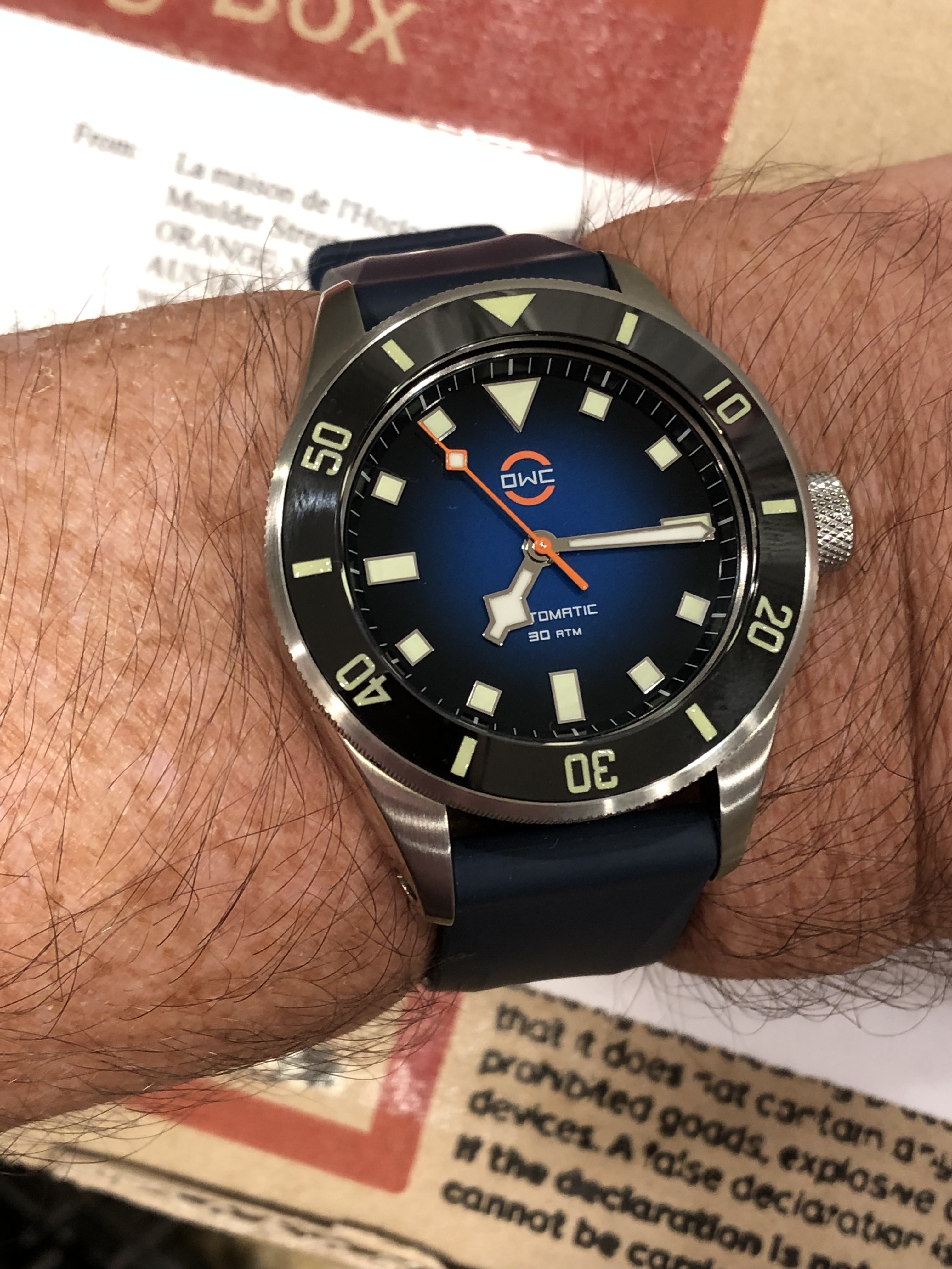 Each OWC comes in a Pelican-style, OWC-branded waterproof box that I reuse when on the beach. Outside of the Pelican case, is the custom designed and made outer case, cut from bombproof 1cm thick high density polyethlene that is initially a puzzle to open. Here you can also see why I chose the blue Scurfa strap – it matches the dial almost perfectly and is the most comfortable dive strap I own.