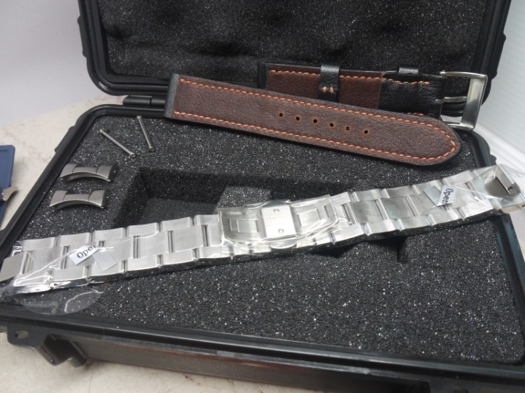 Showing the strap lining, solid end links and deployant clasp. Also note the foam cubes in the Pelican case; this lets you customize the storage space in case you want to reuse it for a camera, phone, etc.